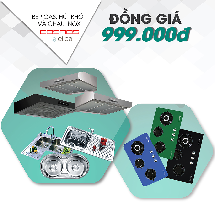 ƯU ĐÃI ĐỒNG GIÁ 999K: Áp dụng một số mẫu bếp gas, máy hút khói, chậu inox cosmos