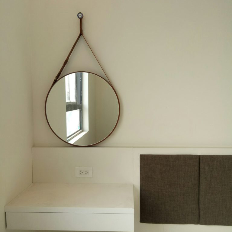 Gương bàn trang điểm ngoài chức năng thông thường mà còn có chức năng có thể kết hợp được với nhiều kiểu bàn trang điểm khác. Thiết kế với hình dạng tròn và kèm dây da bò chắc chắn thích hợp để treo tường nên sẽ dễ kết hợp với các loại bàn trang điểm đơn giản.