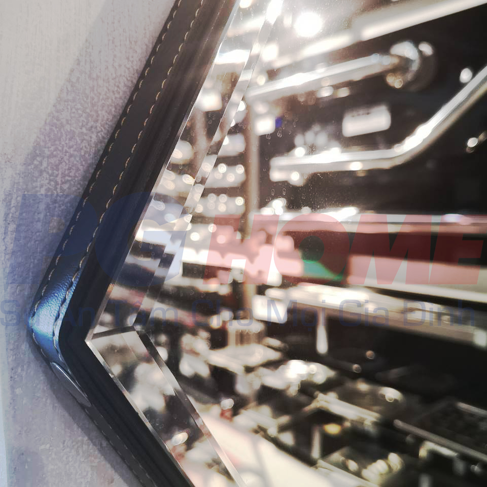 Gương lục giác phối da cho bàn trang điểm có xuất xứ từ Indonesia với phôi gương sản xuất tại Bỉ (AGC) cho hình ảnh trung thực.