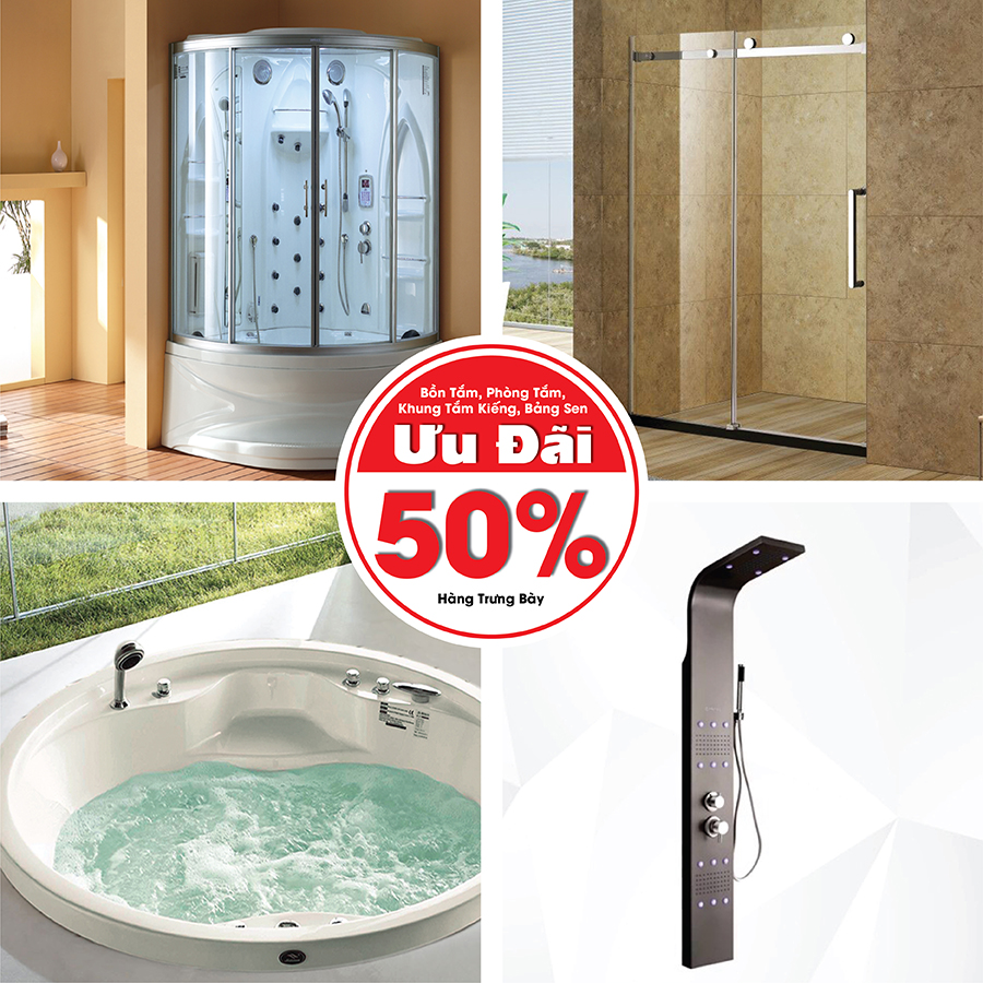 - ƯU ĐÃI 50% HÀNG TRƯNG BÀY áp dụng cho BỒN TẮM, PHÒNG TẮM, BẢNG SEN VÀ KHUNG TẮM KIẾNG