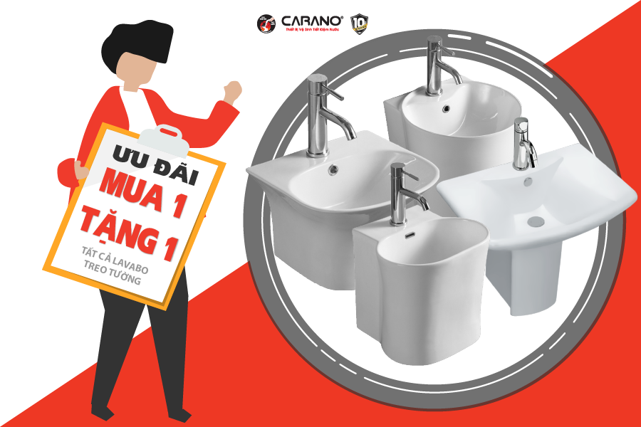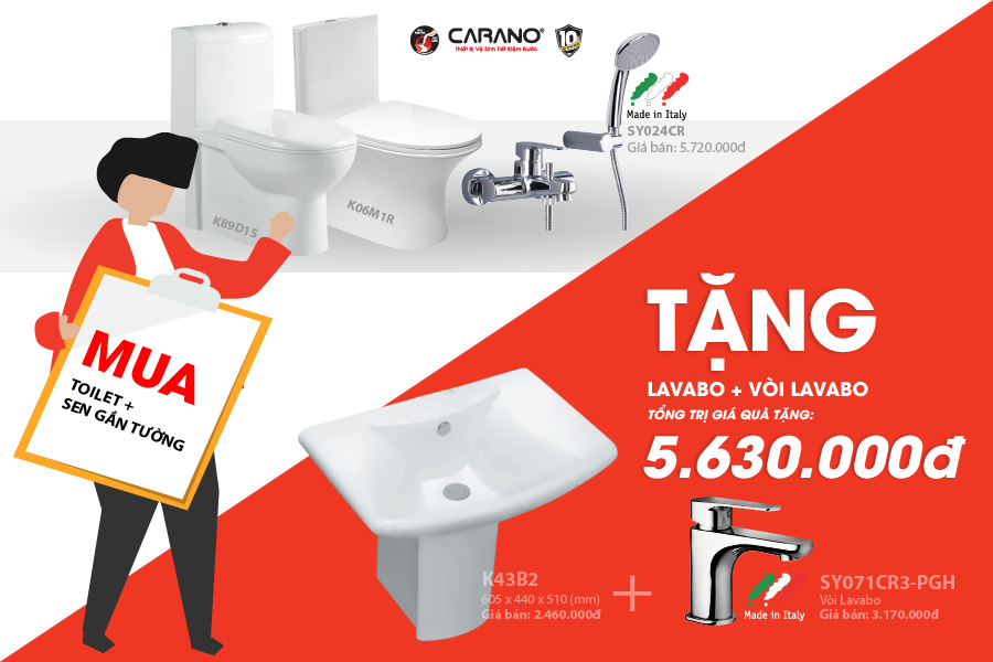 MUA 1 TẶNG 1 TOILET 1 KHỐI CARANO: K85S1S, K06M1R, K86AS75MV, K10D1R và TẤT CẢ LAVABO TREO TƯỜNG